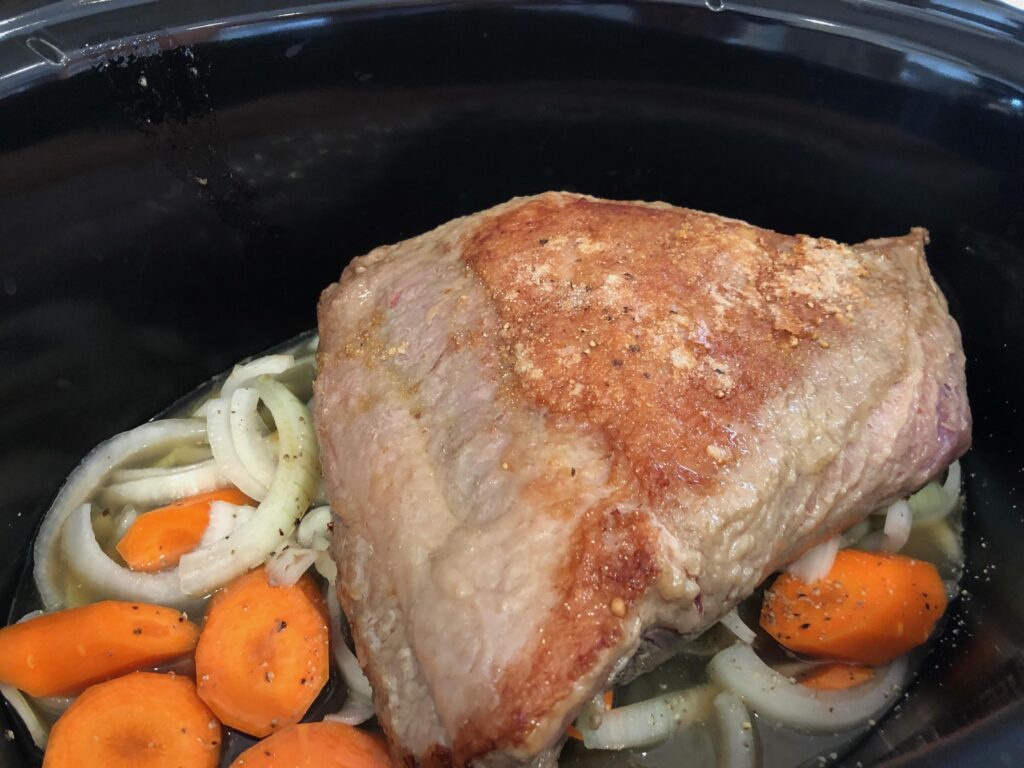 If you are going to sear the meat, get a big pan and heat it to at least medium, maybe higher. Add some olive or vegetable oil like avocado. Place the meat in the pan and don’t move it around. Allow it to brown for 2-3 minutes per side. Try to brown all four sides if you can and possibly the sides depending upon the shape. If you are using a crock pot, remove the meat and place in the crock pot. You can then add some water to the hot pan to get some of the flavors from the “fond” (that’s what the brown bits are called in the bottom of the pan). Proceed with the recipe for the crock pot.
