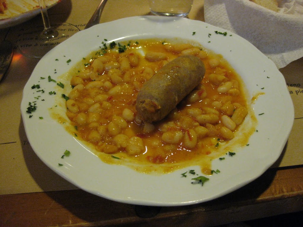 Below is a picture I took of a dish we had in Italy. I’m sure the beans, sausage and tomato sauce were fresh. If you want to take a cheap trip to Italy (ok, you’ll have to close your eyes and imagine), try the recipe below.